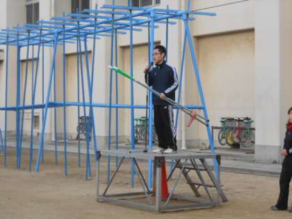 児童朝会で体育主任のA先生から竹馬の紹介がありました。PTAのベルマークで購入したものです。たいせつに使ってください。