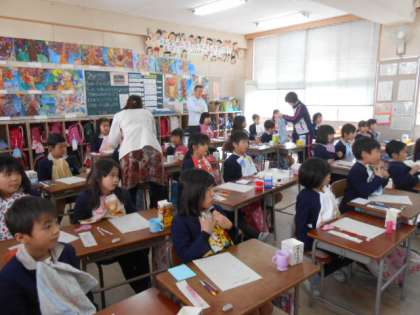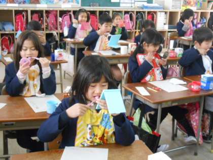 3時間目は、2年生のはみがき指導でした。磨きのこしがないか、歯ブラシの持ち方は良いか、正しい磨き方ができているかみんなで、チェックしながら歯の学習をしました。