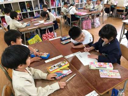 今日は自分たちの係のメンバー表を作りました。なかよく協力しながら作成することができましたよ。