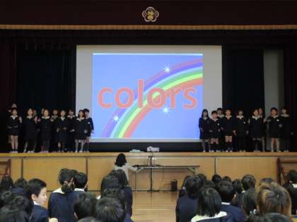 クリス先生の司会で各学年が英語の歌やゲーム、クイズ、読み聞かせなどの発表をしました。