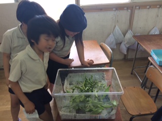 放課後に残っていた何人かの子どもたちで虫カゴのお掃除をしました。