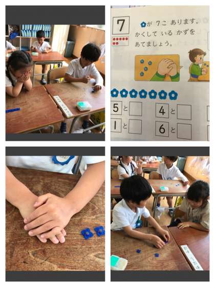 7つあるおはじきのうち、手の中に隠しているおはじきの数を当てます。子どもたちは大盛り上がり!楽しみながら学習することができました。