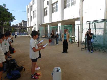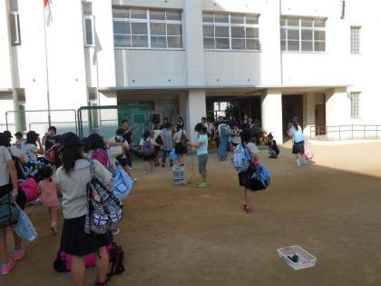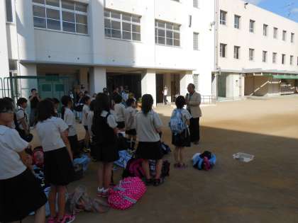 お迎えに来てくださった保護者の方々を前にして帰校式。