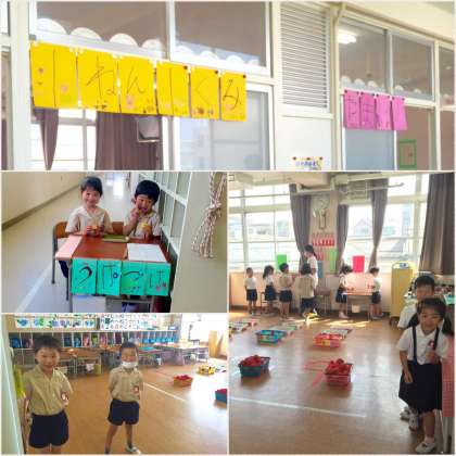 1-2は【かぁどあそびやさん】のお店で、ひらがなのカードを合わせて言葉を作るゲームで、遊びに来た人みんなが白熱していました!