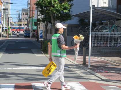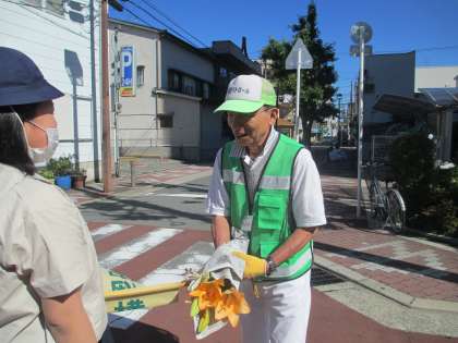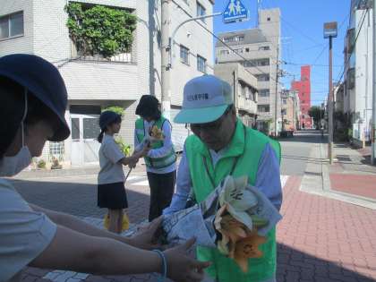 はぐくみネットのみなさんのご協力のもと、いつもお世話になっている見守り隊のみなさんにゆりの花を届けました。