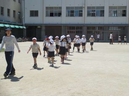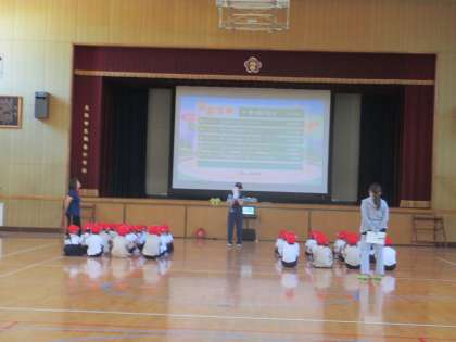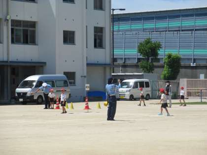 此花警察から指導に来てくださいました。講堂でクイズを交えた講義と運動場での正しい歩行の実践を前半と後半に分けてしました。