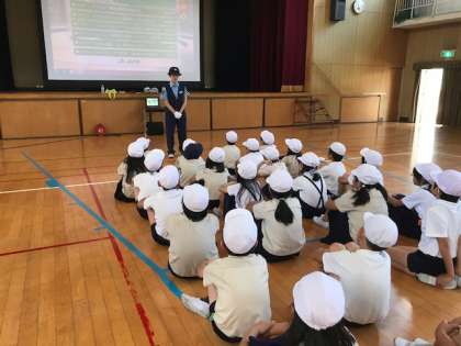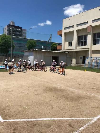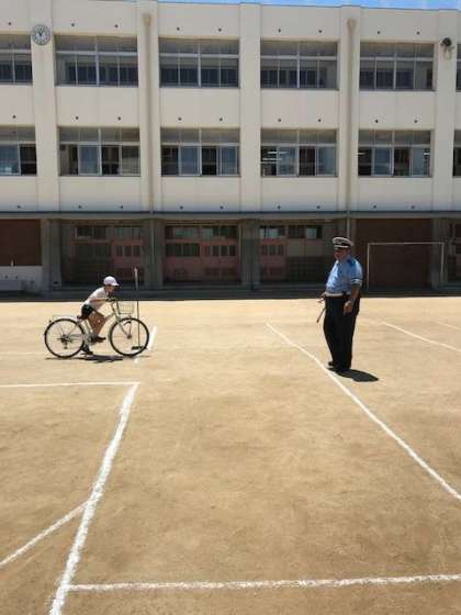 前半は運動場で、自転車に乗って、歩道を通行する方法や周りを確認する方法を実際に体験しました。