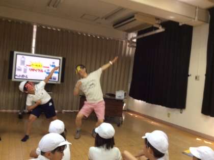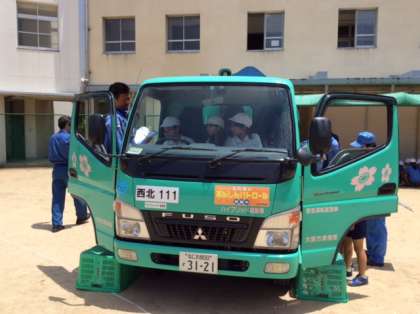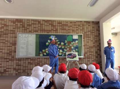 環境事務局の方々に来ていただき、笑い満載の劇やパッカー車乗車体験、記念撮影、紙芝居と、たくさんの活動をさせていただきました。