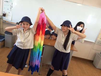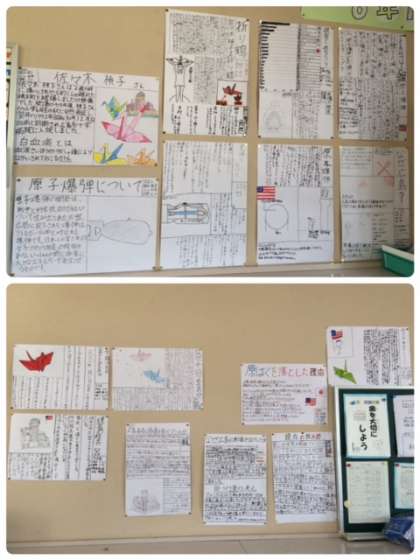 また、平和学習のまとめもできました。それぞれの班で調べたものをまとめて掲示しています。