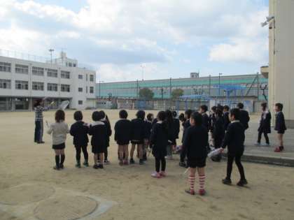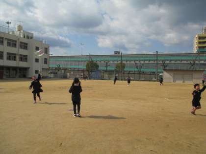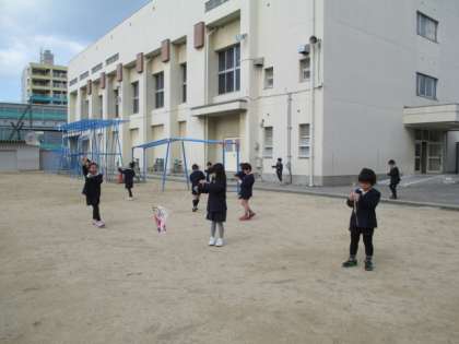 生活科で作った「ぐにゃぐにゃだこ」を運動場であげました。