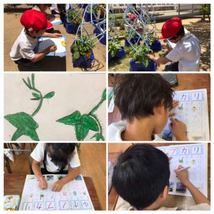 今日の生活科はあさがおの観察。立派なツルが伸びてきました!触ってみたりしながら、じっくりと観察し、カードに記録しました。