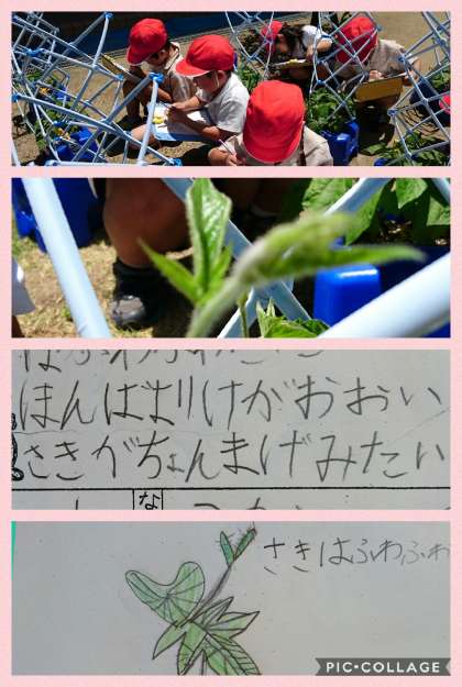 朝一番、あさがおの水やりに行った子が「先っちょに、チョンマゲみたいなんがある!!」と、大慌てで教室に戻ってきました。