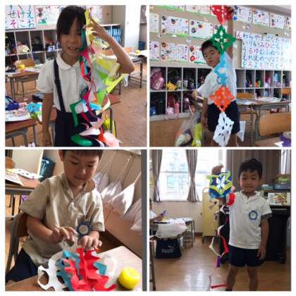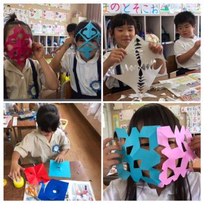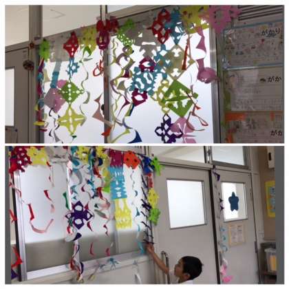 今日の図工は先週から子どもたちが楽しみにしていた「チョキチョキかざり」本番の日。先週練習した色々な切り方を使って、壁飾りを作りました。切り方・色合い・つなげ方など、子どもたちの工夫が盛り込まれた作品が次々と出来上がり、とっても華やかな教室になりましたよ。