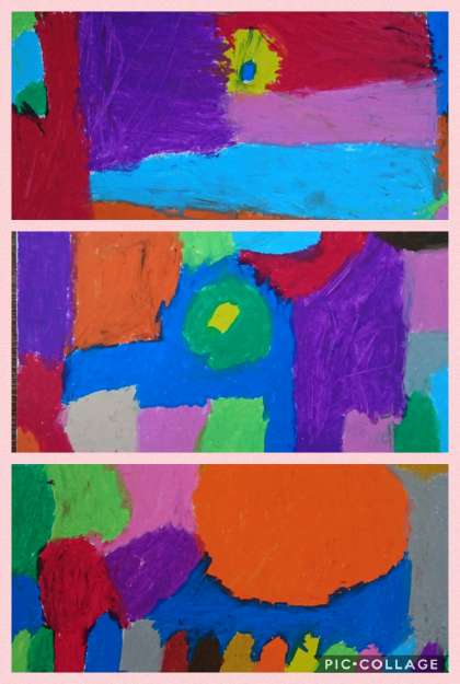 白い画用紙にクレパスで隅から隅までしっかりと自分の好きな色を塗り込みました。