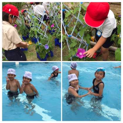 朝から子ども達の「先生〜、あさがおの花がまた咲いてる〜!」との嬉しい報告が次々と!「あさがおって一個花が咲くんかなと思ってた。こんなにいっぱい咲くと思ってなかった〜。」と言っている子もいましたよ。これからもっともっと咲くからね♪