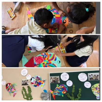 そして図画工作科!先週、製作途中で終わってしまっていた「おおきなさかな」を仕上げました!どの班も念入りに仕上げをし、お魚に名前を付けて・・・完成!!1年2組の教室が、ステキな海の世界になりました!