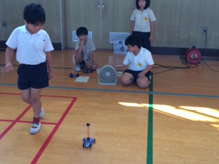送風機を使って弱い風と強い風ではどちらが遠くまで車が進むのか実験しました。