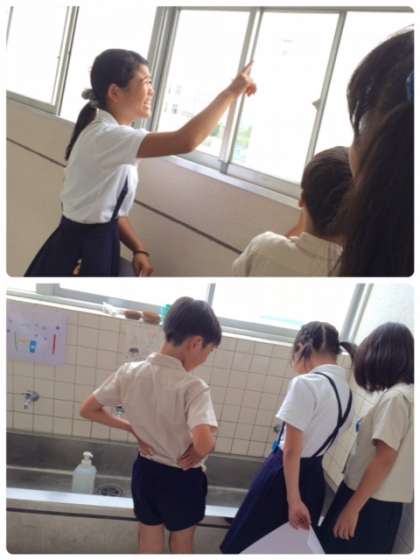 「手洗い場汚れてる!これ、6年生が図工のあとに洗い残した絵の具やなー」