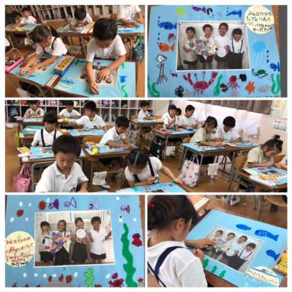 今日は以前、グループのメンバーと協力して作った「おおきなさかな」の写真をもとに、一人ひとりが海の世界を表現しました。まずはグループ写真を画用紙に貼って、次に「おおきなさかな」を作ったときの感想を貼り付け。その周りに海の生き物を描いていきました。写真や感想を貼る場所、貼る角度、その周りに何を描くか・・・。いろいろと工夫を盛り込みながら、ステキなステキな海の世界が出来上がりました♪