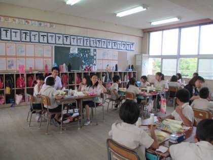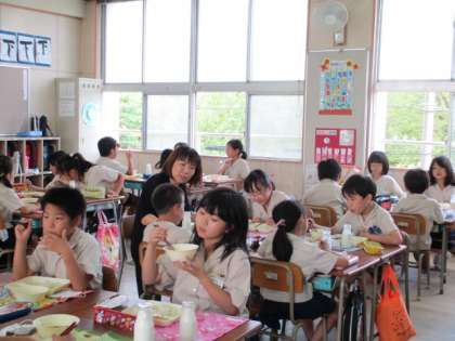 ゲストティーチャーの長岡様と西原区長が3年生と一緒に給食を食べました。