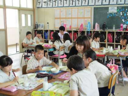 JICA長岡様と西原区長と一緒に給食を食べました。