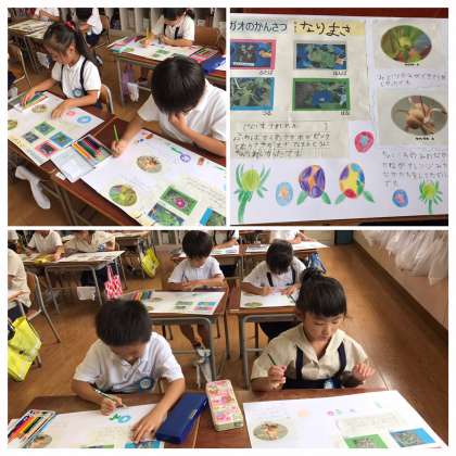 そして、生活科。あさがおの成長を振り返りました。まずは夏休みからお家でお世話をしているあさがおの様子を発表。「緑色の実は固くてツルっとしていて可愛かったです。」「茶色の実の中には5つも種が入っていてびっくりしました。」などなど・・・。「まだまだ咲いてるで!」との声に「うちも!」「私のも!」とクラスの半分以上の子達が手を挙げました。みんな上手に育ててくれているんですね。学習の最後には、あさがおの成長を一枚の画用紙にまとめました!