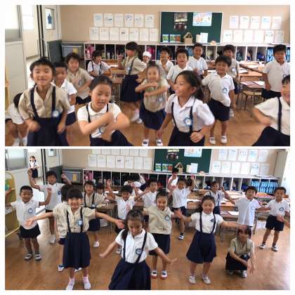 ここでおまけ写真。今日の休み時間の様子です。雨で運動場が使えなかったので、教室で運動会のダンスを踊る子ども達。ノリノリ、大盛り上がりでした♪