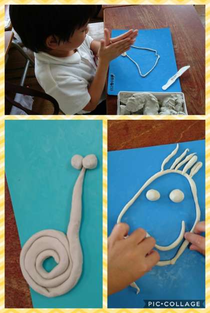 名前の通り粘土を紐状に細くのばし、平面、立体、自由に作品を作っていきます。