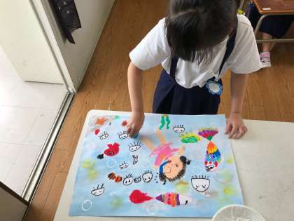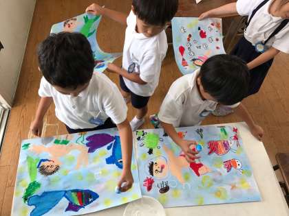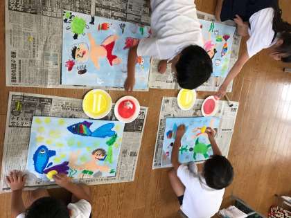 毎週金曜日になると、「今日の図工なんやろう?」「楽しみやなぁ」という嬉しい声が聞こえてきます。今日は、以前から描き進めていた「うみのなかをたんけんしよう」の絵の仕上げです!たんぽを使って海の色を豊かにし、ペットボトルのキャップを使って水中の泡を表現しました。「楽しい♪」「めっちゃきれいにできた!」と、作品の仕上がりに大満足の子ども達でした。