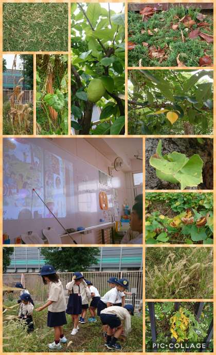 教科書で夏から秋への変化について学習した後、実際に校庭で秋見つけをしました。