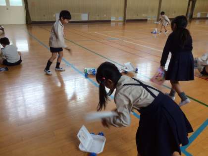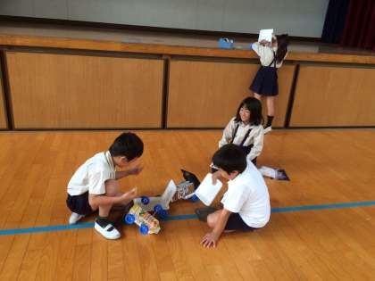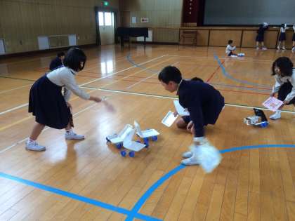 風を受けるところをつけかえてどちらが速く動くか、試している子もいました。
