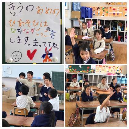今日も生憎のお天気でしたが、遊び係さんが「なぞなぞ大会」を開催!お昼休みはみんなで大盛り上がりでした♪