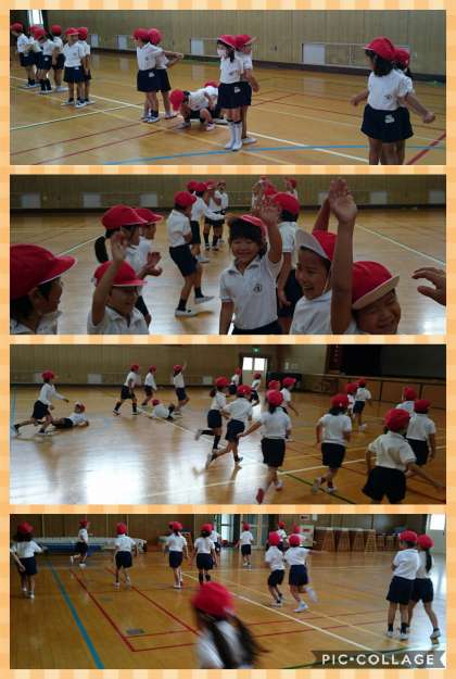 縄跳び、体ほぐしの後は『ねこ、ねずみ鬼ごっこ』とアレンジバージョンの『ドラえもんドラミちゃん鬼ごっこ』