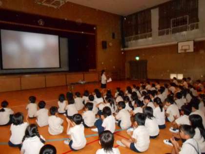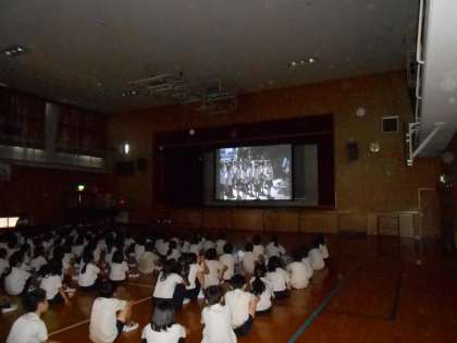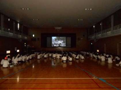 児童集会の時間を使って、修学旅行の報告会をしました。VTRは、平和記念公園でみんなが折った千羽鶴を捧げる場面です。在校生は静かにその映像を見ていました。