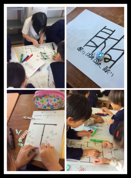 オゾボットというライントレースロボットでプログラミング学習を進めています。動かし方を考え、カラーコードの指示をロボットに読み込ませていました。小さなかわいいロボットが動く姿に大喜びし、楽しんでプログラミング思考の基礎を学びました。