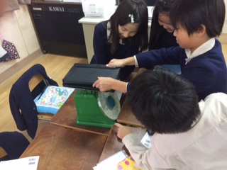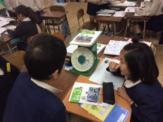 使い方もバッチリな児童たちは、教室にあるタブレットや習字道具など、様々な物を手にとりはかりにのせていました。