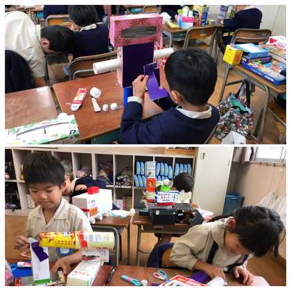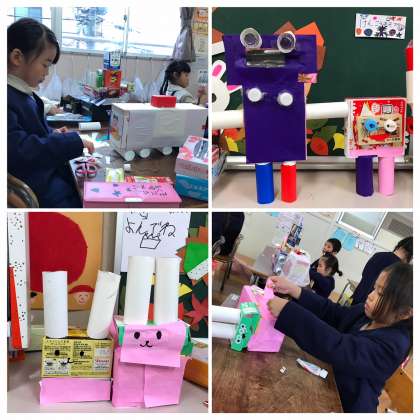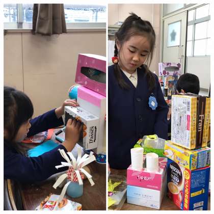 以前から少しずつ作り進めている「はこでつくろう」の作品作り。本日、全員完成しました!それぞれのこだわりが詰まったステキな作品が勢揃い!愛情を込めて作った作品の出来栄えに、満足顔の子ども達でした♪