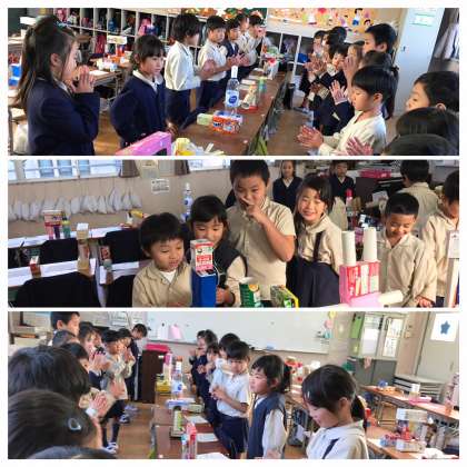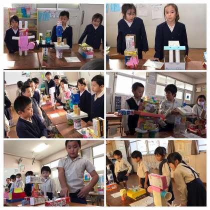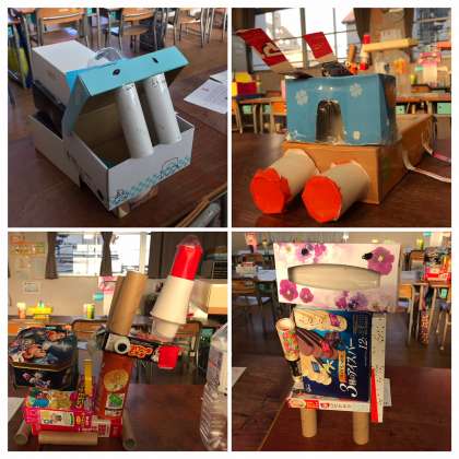 昨日完成した「はこでつくろう」の作品たち。今日は「作品発表会」を開きました。1人ずつ自分の作品の名前やお気に入りポイントなどを紹介!発表しているときは緊張の面持ちでも、友だちから拍手をもらうと笑顔が♪友だちの作品を見る子どもたちからは「わぁ、すごい!」「かわいい!」「かっこいい!」など自然と称賛の声が♪とってもステキな1時間となりました。