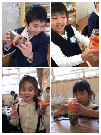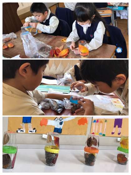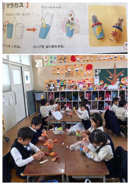 今日は、子どもたちが集めた「秋」でマラカス作りをしました。まずは校庭の落ち葉集めからスタート!お気に入りの葉っぱを取ってきた後は、コップにどんぐりや松ぼっくりなど、思い思いの材料を入れて、ビニルテープで固定。お友だちと協力しながら慎重に作業をしていました。仕上げに、拾ってきた葉っぱを貼ってデコレーション♪おしゃれなマラカスの完成です!入れるものや、量の違いで音も違います。世界で一つのオリジナルマラカスが完成しました!