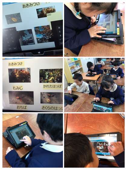 タブレットの「発表ノート」という機能を使って「あきみつけカード」を作成しました。タブレットのカメラで撮影した、数ある「あき」の写真の中から自分のお気に入りの写真をセレクト。新しく使い方をマスターした文字入力機能を使って、自分がセレクトした写真にタイトルをつけてまとめていきます。文字の大きさを変えたり、写真をトリミングしたりと、子ども達の覚えのはやさには驚かされます。カードの完成が楽しみです♪