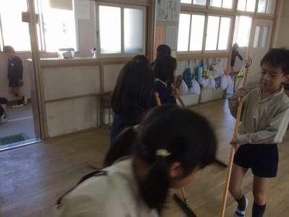 廊下は、砂がいっぱいありましたがきれいに掃いていました。この後、雑巾がけをしています。