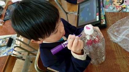 ペットボトルにカエデ、イチョウ、キノコ、赤トンボ、柿等の絵を描き…