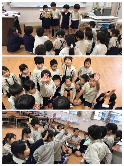 今日のみんな遊びは「増え鬼」の予定だったのですが、運動場に出るとパラパラと雨が・・・と、いう訳で、急遽みんな遊びを「なぞなぞ大会」に変更しました。もちろん、大盛り上がり!クラスみんなで楽しく過ごすことができました。遊び係さん、いつもありがとう♪