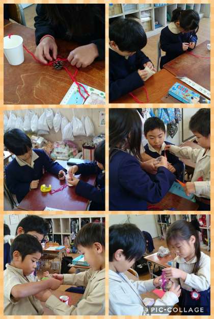 秋の金メダル、朴葉のお面、ペットボトルのマラカスに続き、まつぼっくりのけん玉、プラコップのマラカスを作りました。