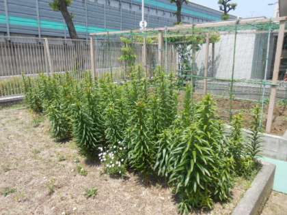 学習園に昨年植えた ユリが今年も大きく成長しました。舞洲ゆり園と同じ花が咲きます。