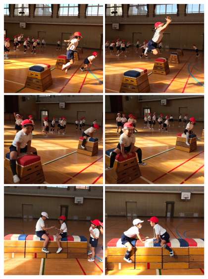 跳び箱遊びをしました。「イエーイ!」と子ども達から歓声が上がります。まずは跳び箱を自分たちで運ぶことから始めなければなりません。友だちと協力しながら安全に運ぶ方法を学習しました。それから、跳び箱を使って色々な動きにチャレンジ。跳び箱の上からジャンプしたり、跳び箱にまたいで乗ったり、下りたり!最後には赤チームVS白チームで、跳び箱をまたいだまま進むジャンケン大会をしました!大盛り上がりの1時間となりました。