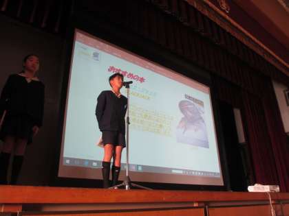 今日の全校集会は、図書委員による「私のおすすめの本」紹介でした。