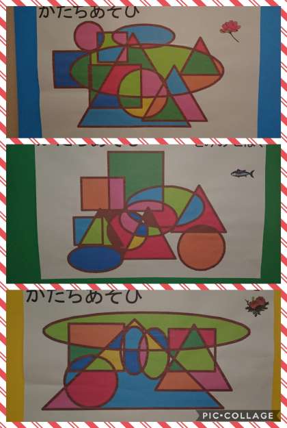 ◯△□を重ねただけなのに、とってもカラフルで楽しい作品が完成♪