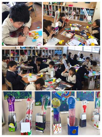 今日は土曜授業で取り組んだ「なにがでてくるかな?」の作品作り、完結編です!折り紙やカラーペンを駆使して、箱を装飾していきました!「見てー!」「ぼくのも見てー!」「わたしのも見てー!」作品作りが進む度に「見て見てコール」が飛び交います。本日持ち帰っていますので、大きくレベルアップした作品をご覧ください!