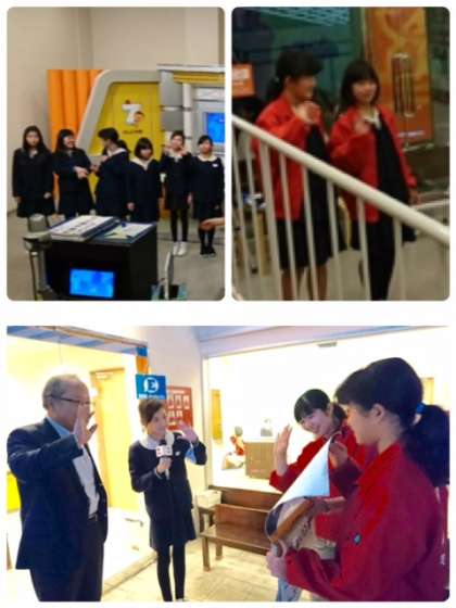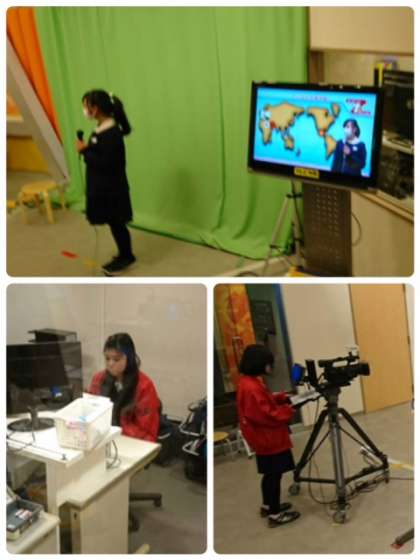 放送局のお仕事では、カメラマン、お天気キャスター、中継、音声、カメラチェックなどの様々なお仕事があるようです。通行人は校長先生、英語でのインタビューです。